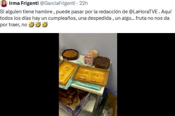 "Si alguien tiene hambre , puede pasar por la redacción de La Hora de la 1. Aquí todos los días hay un cumpleaños, una despedida, un algo… fruta no nos da por traer, no 🤣🤣", ha escrito la comunicadora.