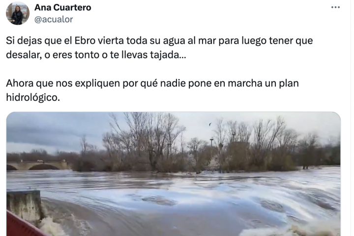 Una de estas opiniones la ha dado la diputada de Vox en la Asamblea de Madrid Ana Cuartero. En un tuit publicado en su cuenta de X en el que ha compartido un vídeo del cauce a su paso por La Rioja, la política ha añadido lo siguiente.