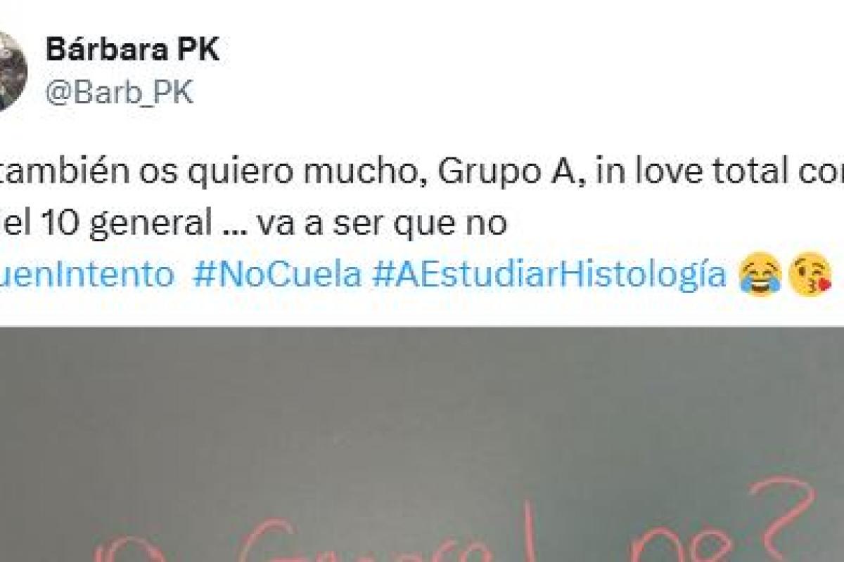 En un mensaje redactado con tiza se puede ver como primero le piden por un 10 general para toda la clase del grupo A para después, y en un recuadro, escribirle un "nosotros queremos a Bárbara y Celia" dibujando un corazón.