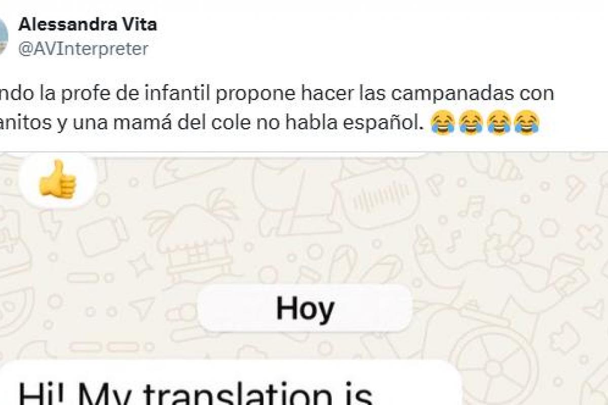 "Cuando la profe de infantil propone hacer las campanadas con gusanitos y una mamá del cole no habla español. 😂😂😂😂", ha afirmado, junto a la captura de pantalla de dicho mensaje redactado en inglés.
