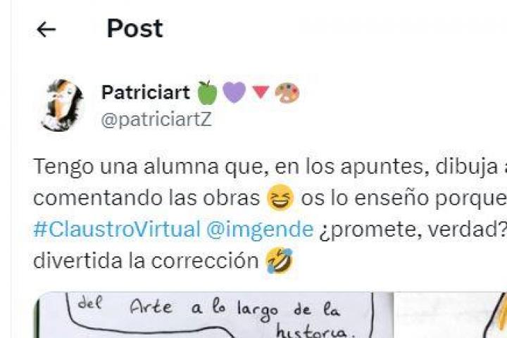 "Promete, ¿verdad?", ha preguntado la docente. Antes de revelar la hazaña, ha asegurado que este tipo de cosas "hacen más divertida la corrección". Y es que la menor "dibuja a su 'mini yo' comentando las obras" de arte que les ha estado enseñando la tuitera en clase.