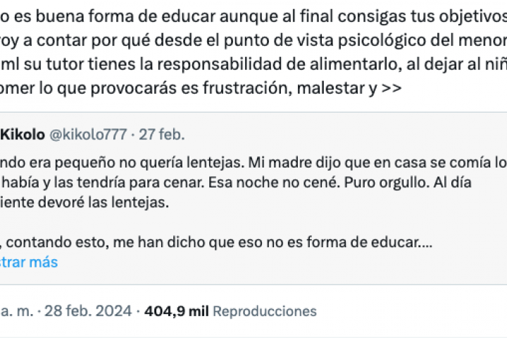 Más de 400.000 personas han visto el hilo que ha compartido la psicóloga @fxckyoumore en X, anteriormente Twitter, en respuesta a un comentario de una persona que contaba cómo su madre lo obligaba a comer lentejas.