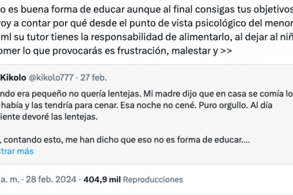 Para acabar, ha pedido a los padres que no se conviertan en enemigos de sus hijos porque si es malo "someter por la fuerza a un adulto" también lo es hacerlo con un niño: "Y por cierto, me he saltado todos los TCAs que esto puede provocar porque con eso tengo para 10 hilos más. En fin, la comida es una necesidad, no una recompensa ni un castigo".