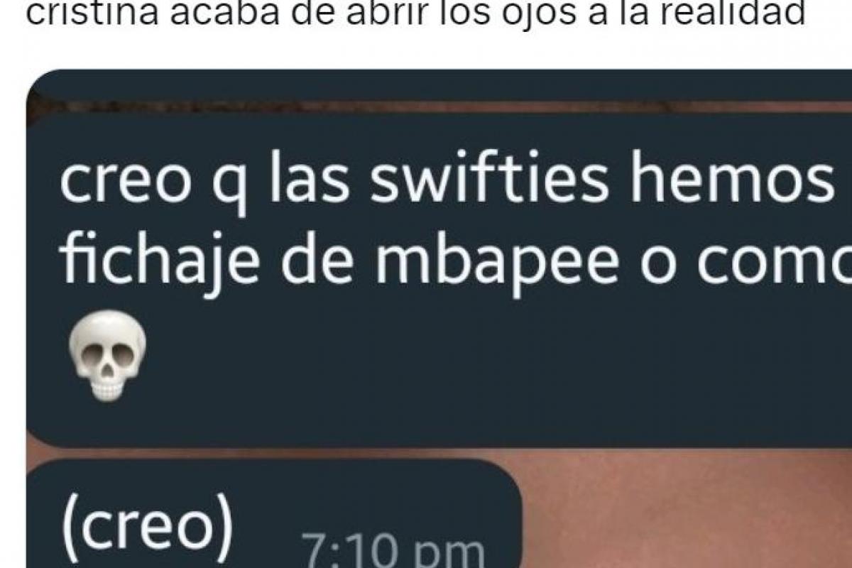 Asimismo, el tuitero ha titulado la fotografía de la conversación con un divertido: "Cristina acaba de abrir los ojos a la realidad", una broma que le han seguido los usuarios de la red social en la sección de comentarios: "el de Mbappé y alguno mas, gracias swifties".