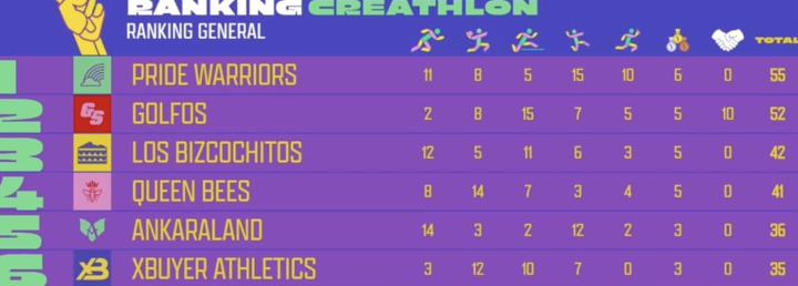 Un total de seis equipos compitieron por la victoria. Sus abanderados fueron nombres para nada desconocidos. Las creadoras de contenido Carla Flila y Lucía de la Puerta, junto al equipo 'Pride Warriors', se alzaron con la medalla de oro de 'Creathlon', las primeras olimpiadas para creadores de contenido en la historia de España. Tresco y Martí Miras (Spursito), con 'Los Golfos', celebraron a lo grande la medalla de plata después de la remontada en la clasificación gracias al premio a la deportividad.