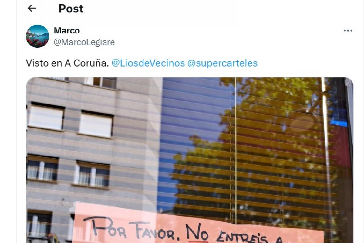 Del letrero se ha hecho eco la popular cuenta @LiosdeVecinos y ha generado una multitud de reacciones. Por ejemplo, una persona dice: "Me recuerdan los carteles en algunos coches en Madrid en los 90 tipo, señor ladrón/drogodependiente, el coche está abierto no hay radiocasset ni nada en la guantera, por favor si lo necesita para dormir a las 7 me hace falta para ir a trabajar, gracias".