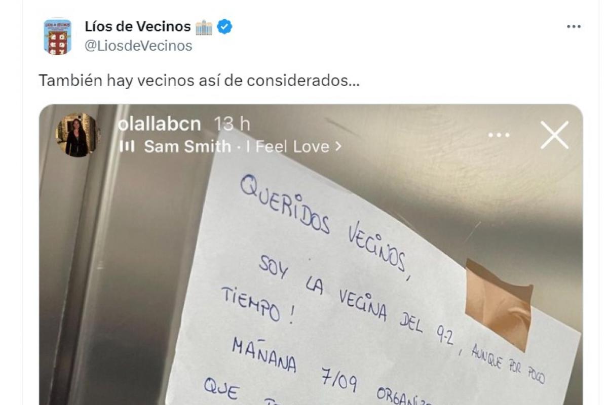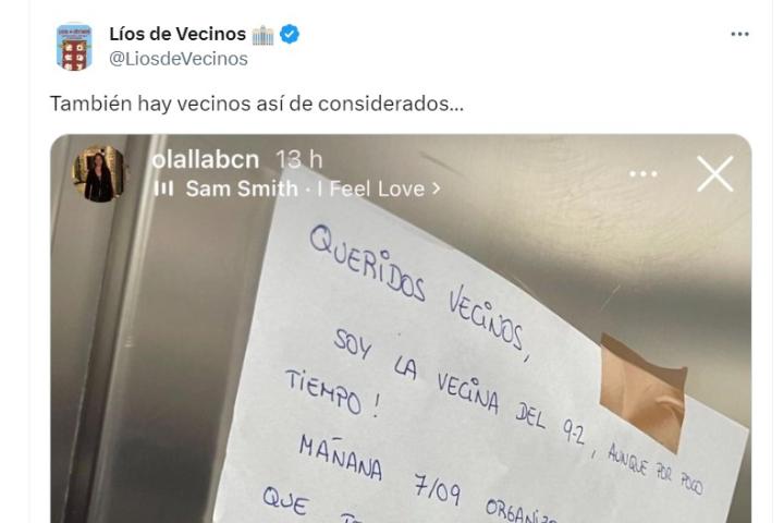 En el mensaje, del que se ha hecho eco la popular cuenta @Liosdevecinos, se puede leer: "Queridos vecinos, soy la vecina del 9-2, ¡aunque por poco tiempo! Mañana 7/09 organizo mi mudanza, por lo que tendré que acaparar el ascensor bastante más de lo normal".