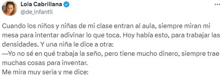 La profesora de infantil Lola Cabrillana (@de_infantil) ha contado a través de su cuenta en la red social X una adorable anécdota que ha vivido con una de sus alumnas, quien le ha hecho una pregunta que ha dejado pasmada a la maestra.