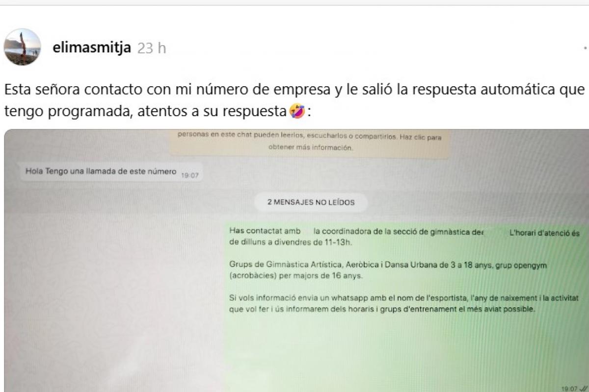 "Esta señora contactó con mi número de empresa y le salió la respuesta automática que tengo programada, atentos a su respuesta", ha escrito en la red social Threads la usuaria elimasmitja.