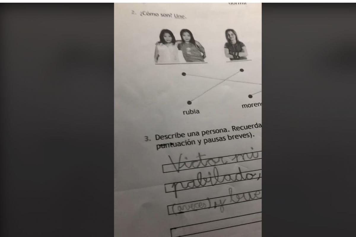 "Víctor, mi tutor, es: majo, espabilado, calvo, dramático (a veces) y bueno", escribió el niño en una respuesta que ha provocado la también magnífica reacción del profesor, que se ha grabado simulando el drama al ver la respuesta.