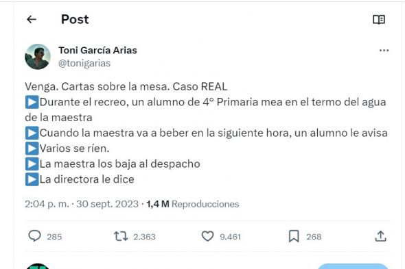 "La maestra insiste y llama a los padres, que la amenazan. A la tutora le dan una baja. El alumno 'chivato' es acosado por el gracioso del pis y amigos. El curso siguiente, la maestra en otro colegio y el niño acosado, también. Así funciona nuestro sistema", remata García Arias.