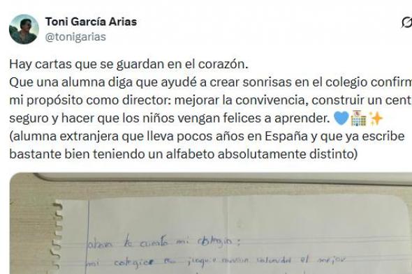 El profesor Toni García Arias, premiado como el Mejor Docente de España en 2018 y ganador del Global Teacher Prize en 2023, ha emocionado en la red social de X al publicar la carta que le ha entregado una alumna del colegio Joaquín Carrión, situado en el municipio murciano de San Javier.