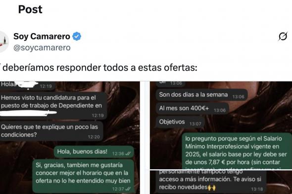 "Lo que quiero decir es que el salario que ofrecéis está casi dos euros por debajo del límite legal por hora en España, por eso solo quería saber mas detalles del contrato si es que la hay, o de las condiciones. Entiendo que nadie oferta un puesto de trabajo para buscar empleados sin saber cuales van a ser sus "condiciones definitivas'", ha zanjado.