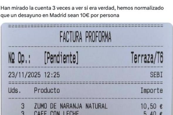 "Han venido unos amigos de Sevilla a pasar el finde y hemos bajado a desayunar. 3 desayunos 31.20€. Han mirado la cuenta 3 veces a ver si era verdad, hemos normalizado que un desayuno en Madrid sean 10€ por persona", ha comentado este usuario de X, logrando en pocas horas más de medio millón de personas alcanzadas en la red social de Elon Musk.
