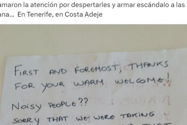 El escrito lo ha compartido la cuenta de X @LiosdeVecinos junto al mensaje: "La respuesta de unos huéspedes/ turistas de Airbnb a los vecinos que les llamaron la atención por despertarles y armar escándalo a las 5 de la mañana... En Tenerife, en Costa Adeje".