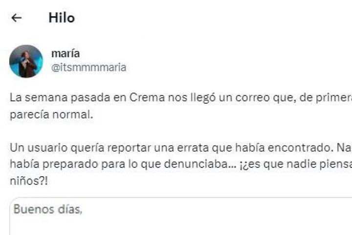 Algo similar le ha ocurrido a esta tuitera con un cliente: "La semana pasada en Crema nos llegó un correo que, de primeras, parecía normal. Un usuario quería reportar una errata que había encontrado. Nada nos había preparado para lo que denunciaba...".
