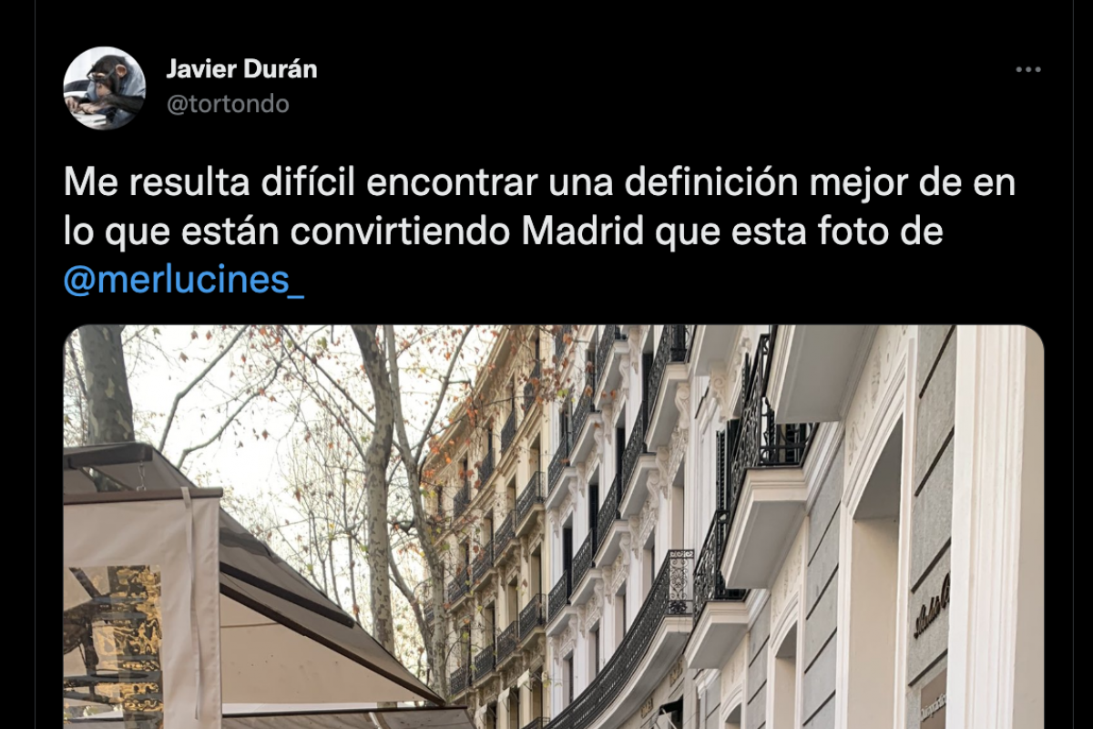 Con la polémica de las terrazas todavía candente, el internauta ha publicado la fotografía con ánimo de denunciar lo ocurrido en Twitter: "Me resulta difícil encontrar una definición mejor que esta foto para explicar en qué están convirtiendo Madrid".