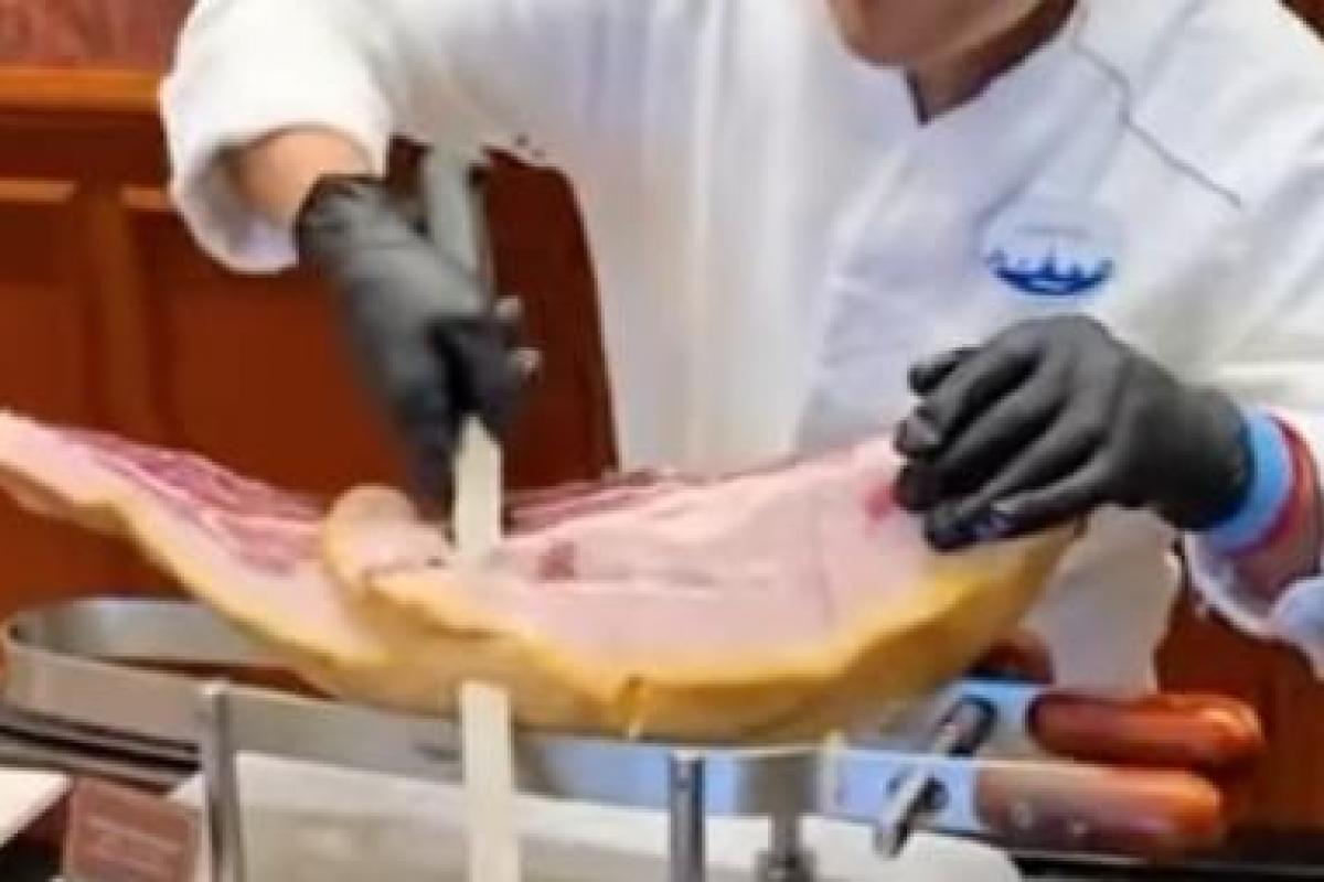 Ahí estaba el cortador, limpiando el jamón. "Mirad el corte del jamón, aquí con su curva perfecta, bien hecha, y mirad como la saca, finita. Madre mía, qué maravilla, muy bien, muy bien", ha ironizado el que grababa el vídeo.