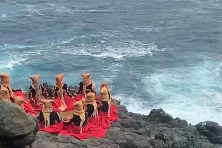 En concreto, en la grabación se puede ver a un grupo de gente en círculo sentados frente al mar, cogidos de la mano y todos vestidos con unos trajes idénticos y con la cabeza cubierta.