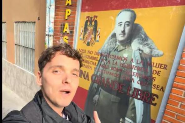 "Estoy en un barrio de Madrid, en un bar un poquito peculiar", ha comenzado diciendo el tiktoker al inicio del vídeo, enseñando los exteriores del bar, en el que se puede ver una bandera de España con una imagen del dictador Francisco Franco encima.