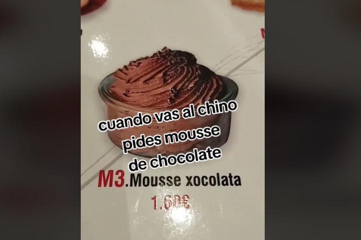 "Mi vida era normal hasta que conocí esto", dice junto a otro mensaje: "Cuando vas al chino y pides mousse de chocolate". En la imagen de la carta aparece un producto que parece casero y cremoso por 1,60 euros.