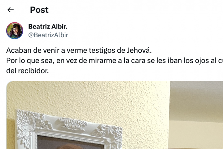"Acaban de venir a verme testigos de Jehová. Por lo que sea, en vez de mirarme a la cara se les iban los ojos al cuadro del recibidor", con este breve pero llamativo mensaje ha triunfado en X, anteriormente Twitter, la usuaria @BeatrizAlbir.