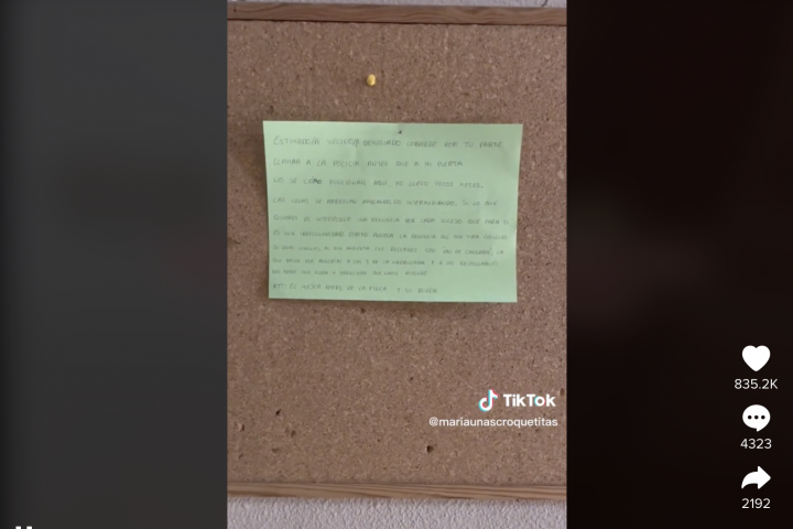 Después ha bajado para hablar directamente con su vecina y viendo que no estaba ha decidido dejarle una nota en el corcho del rellano. Entre medias ha explicado que nunca suele dejar a su perro solo y que siempre va con ella a todos lados, incluso a hacer la compra. También ha contado que trabaja en un pub de noche y que suele dejar a su perro con sus padres para recogerlo después de su jornada.