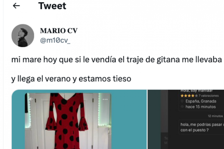 En medio de ese ambiente festivo, el usuario de Twitter @m10cv_ ha publicado uno de los tuits del momento al mostrar lo que le ha ocurrido al poner a la venta en la plataforma Vinted un traje de gitana de su madre.