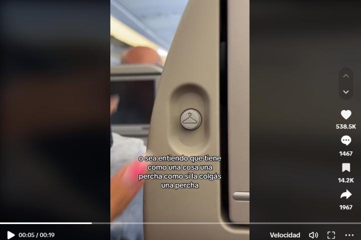"Entiendo que tiene una cosa, como un percha, como si cuelgas una percha. Pero es que acá no entra para colgar nada porque ya estamos en el piso", reflexiona. "Pero mi pregunta es: realmente, ¿para qué sirve eso que está en el asiento del avión? ¿Qué cuelgas? ¿Perchas? ¿Ropa?".