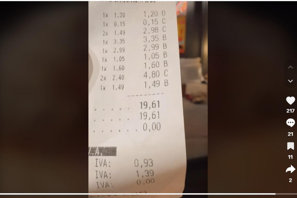 Luego muestra que ha comprado dos latas de cerveza, dos botellas de vino, una gran botella de agua, dos cajas de galletas sin gluten y pan sin gluten. "Adivina cuánto costó. En efecto, estas viendo bien, 19,61. Ridículo", dice.