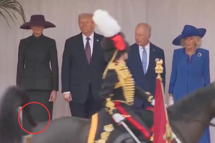 Trump estaba parado y a sus lados su mujer Melania y los reyes de Reino Unido, Carlos III y Camila. Las cámaras lo captaron, fue un miembro de la Guardia Real que pasaba con el caballo y el animar, justo cuando pasa por delante de Trump y compañía, dejó un inesperado regalo: defecó sin importar quién tenía delante.