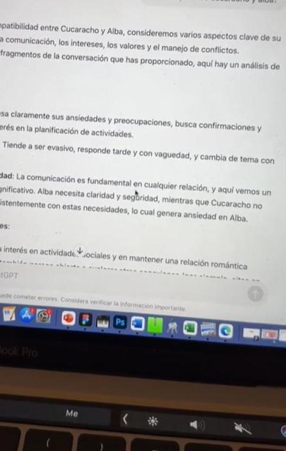 Además, ha explicado que también se le puede preguntar a chat GPT si las personas de la conversación tienen algún tipo de compatibilidad y, ha enseñado como, en su caso, la herramienta informática ha respondido: "La compatibilidad entre ellos es baja".