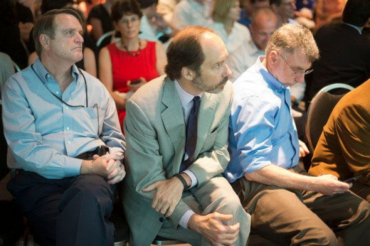 Los tres últimos directores de The Washington Post, el día que se anunció la venta del diario a Jeff Bezos. Aparecen Leonard Downie, izquierda, Marcus Brauchli, centro, y Martin Baron. (Foto: The Washington Post).