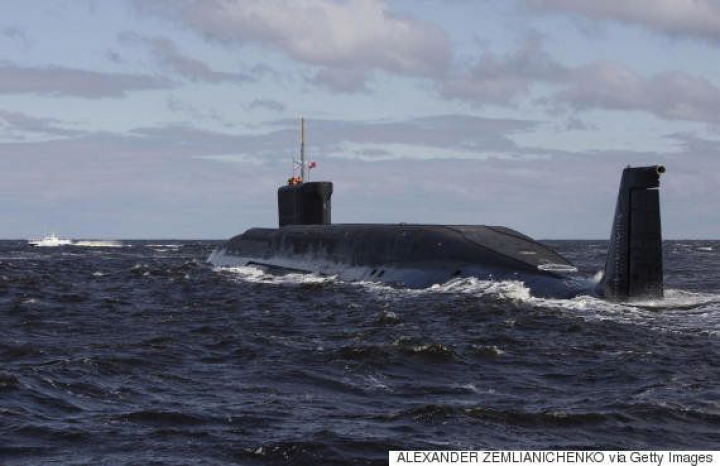 Un nuevo submarino nuclear ruso, el Yuri Dolgoruky, navega por la zona de la fábrica Sevmash en Arcángel, al norte del país. (ALEXANDER ZEMLIANICHENKO/AFP/Getty)