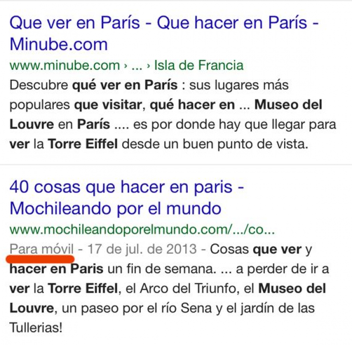 Un aviso similar a este lo podemos encontrar hoy en día cuando realizamos una búsqueda desde nuestro Smartphone. Desde hace tiempo, google indica con una pequeña etiqueta debajo de cada resultado si una web está adaptada para las pantallas móviles o no, mostrando la palabra 'móvil'. Su intención es hacer ahora lo mismo, mostrando, según las pruebas, una etiqueta con la palabra 'slow' (lenta).