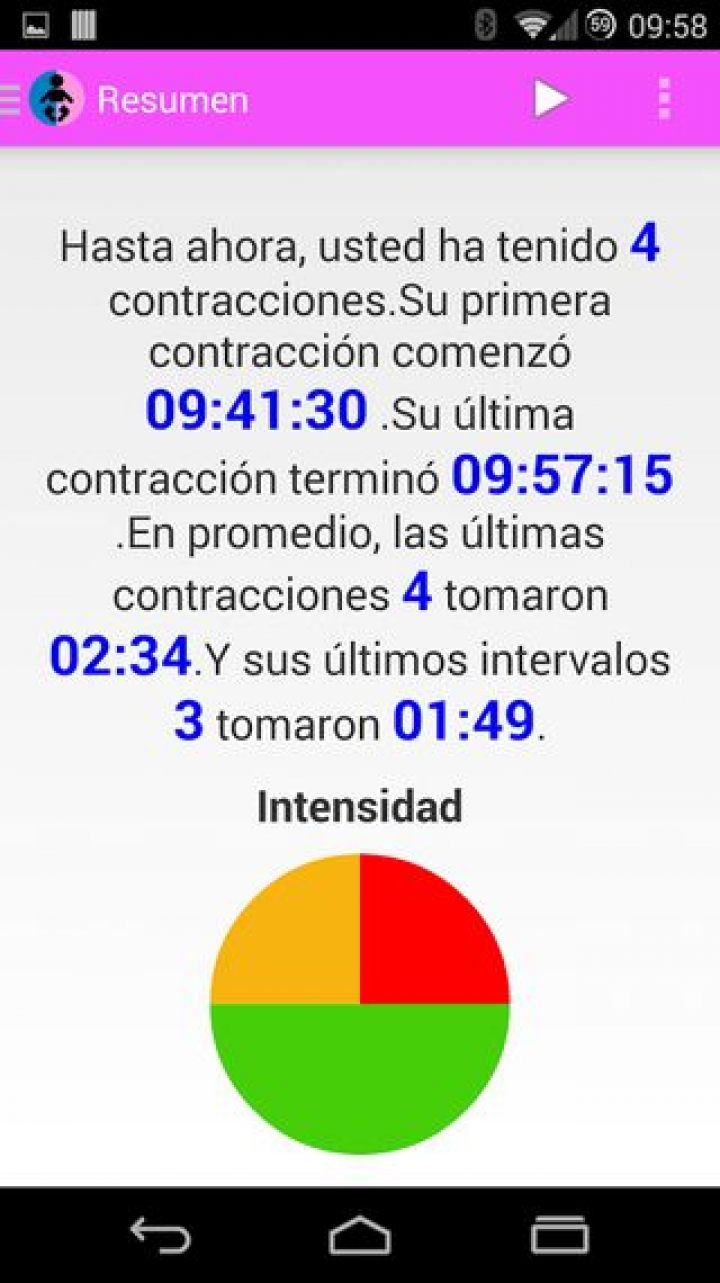 Por eso, para poder solventar esa última cuestión ha nacido esta aplicación, disponible en Google Play de manera gratuita. Ha sido creada por DoubleRouble y, como su nombre indica, lo que hace es contar el tiempo de inicio y final de una contracción, la duración de la misma por tanto, y la frecuencia de las que se producen.