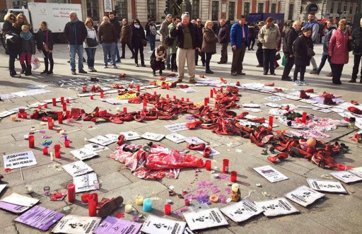 Instaladas en el kilómetro cero de la capital, este grupo de mujeres ha dibujado un símbolo de la paz con zapatos rojos para solidarizarse con el sufrimiento que padecen las víctimas de la violencia machista: "Una vez que denuncias te quedas sin casa, sin comer y sin hijos. Es una forma de visibilizar la situación que viven las mujeres que denuncian". Están débiles. Ha llovido y nevado. Tienen frío. El cansancio se nota en sus caras pero se mantienen juntas cogidas de la mano. Cuando te acercas a hablar con ellas sus ojos se iluminan: "Es muy importante que estemos juntas, que haya sororidad, nosotras también hemos sido víctimas de malos tratos como lo son muchas mujeres. Nos tienen que ver unidas".