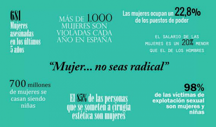 87 mujeres asesinadas en España lo que va de año (681 en los 5 últimos años). Mujer... no seas radical. Más de 1.000 mujeres son violadas cada año en España (una cada 8 horas). Mujer... no seas radical. 1 de cada 3 mujeres es víctima de algún tipo de violencia física o sexual en el mundo. Mujer... no seas radical.