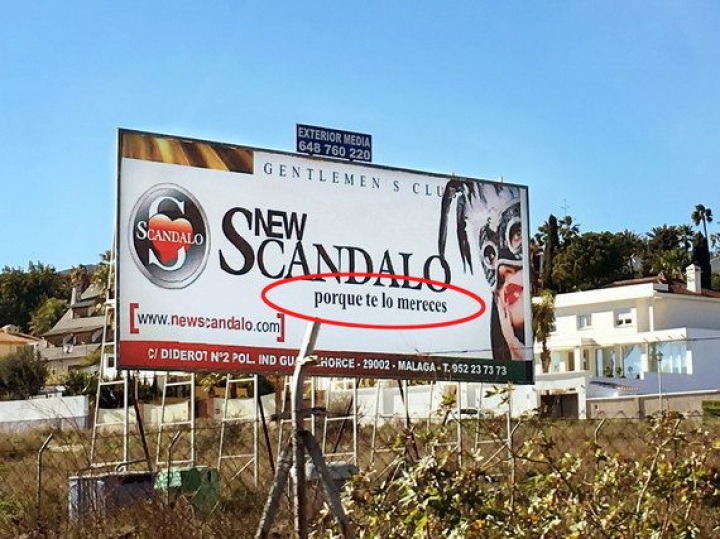 Este es el eslogan que se le ha ocurrido a un conocido prostíbulo de Málaga para promocionar su negocio y atraer a los clientes mientras conducen por la carretera: "porque te lo mereces". Gracias a esta creativa sugerencia cualquier hombre podrá caer en la cuenta a la vuelta del trabajo: "creo que hoy me merezco... ¡una prostituta!" y dirigirse a este 'club de caballeros' para usar el cuerpo de una mujer por un módico precio.